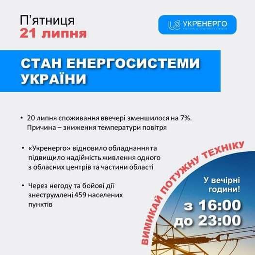 Стан енергосистеми України: 🔹20 липня споживання ввечері зменшилось на 7%