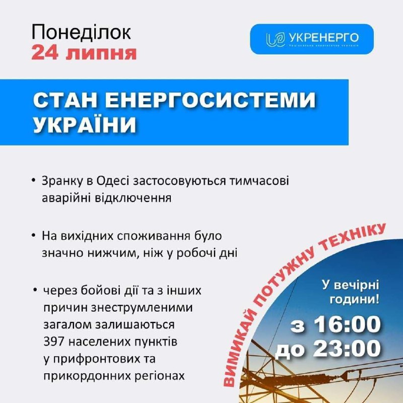 Стан енергосистеми України: 🔹зранку в Одесі застосовуються тимчасові аварійні відключення 24.07.2023, Понеділок | 12:10 Автор допису: Голова Луганської обласної військової адміністрації Стан енергосистеми України: 🔹зранку в Одесі застосовуються тимчасові аварійні відключення 🔹на вихідних споживання було значно нижчим, ніж у робочі дні 🔹через бойові дії та з інших причин знеструмленими загалом залишаються 397 населених пунктів Джерело Друк / PDF