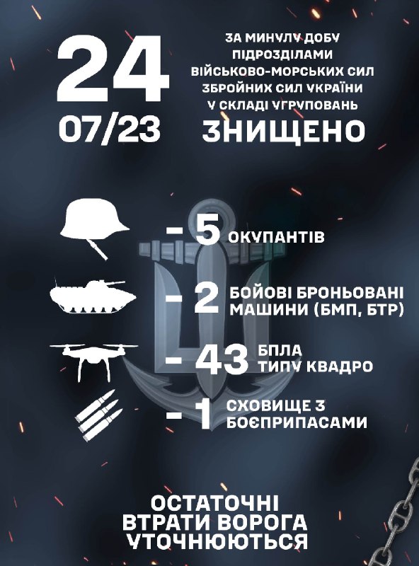 Минулої доби, підрозділами ВМС ЗС України знищено 5 окупантів, 2 бойові броньовані машини, 43 квадрокоптери та 1 сховище з боєприпасами. Остаточні втрати ворога уточнюються.