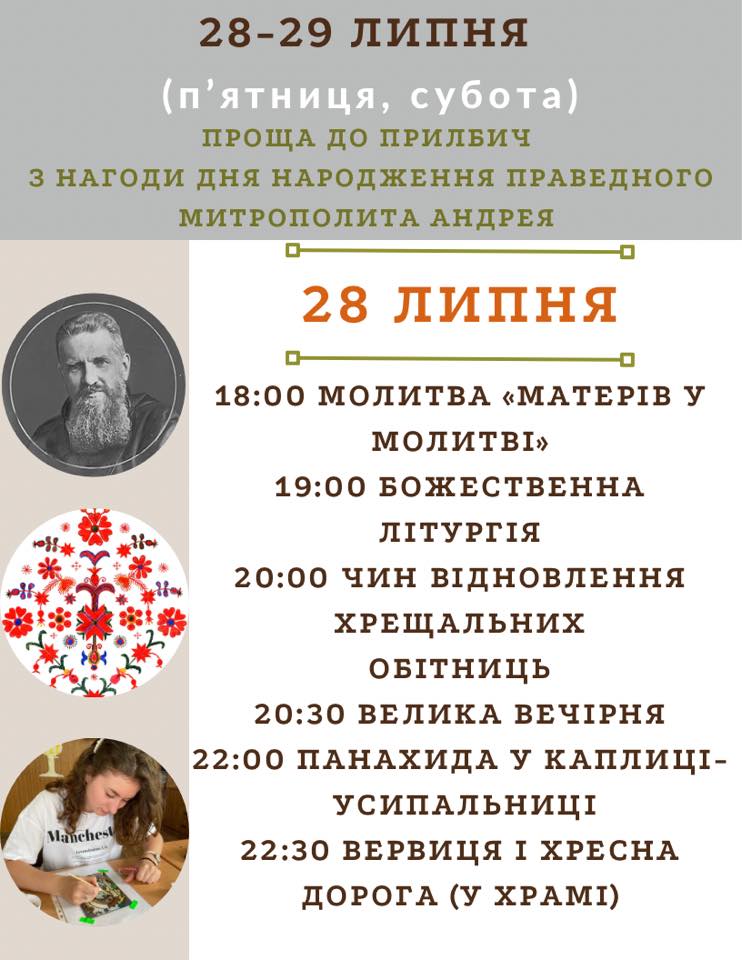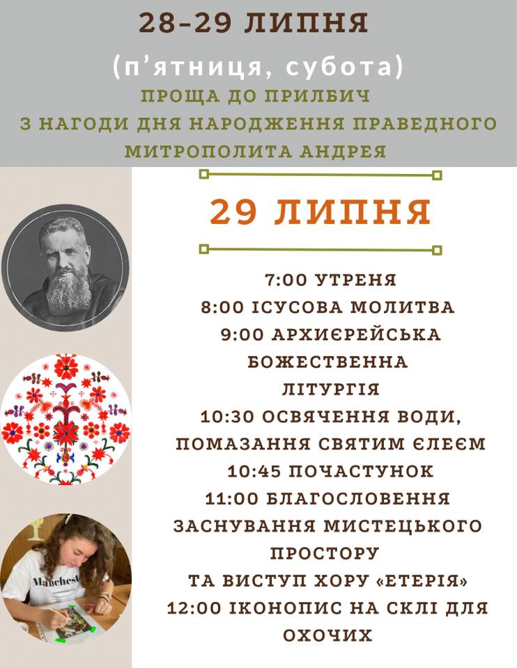 28-29 липня з нагоди дня народження Праведного Митрополита Андрея відбудеться проща до Прилбич.