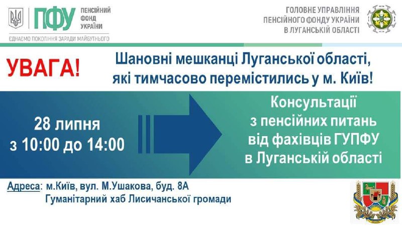 📍28 липня спеціалісти ГУ ПФУ в Луганській області відповідатимуть на запитання внутрішньо переміщених осіб з нашого регіону, які тимчасово мешкають в Києві.