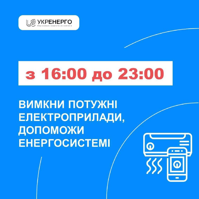Підтримати стабільну роботу української енергосистеми може кожен з вас. У першу чергу просимо не перевантажувати мережу. Особливо в години високого споживання – з 16:00 до 23:00. Будь ласка, вимикайте кондиціонери та не користуйтеся потужними електроприладами у цей проміжок часу.