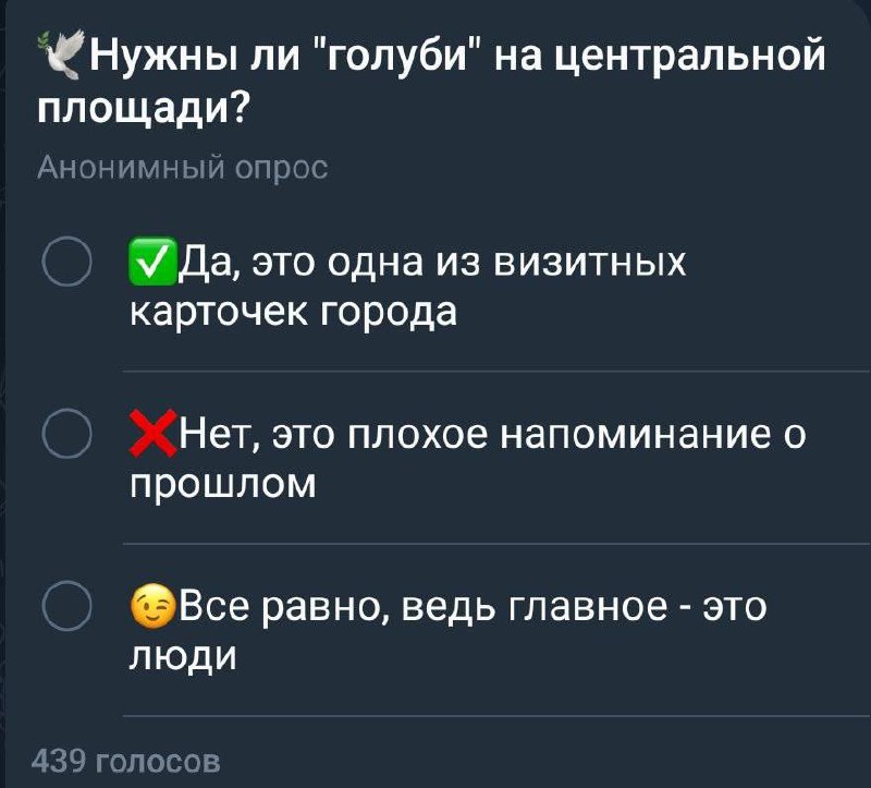 ☝️У колаборантських пабліках зʼявилося опитування жителів міста щодо того, чи потрібні "голуби" на Площі Свободи та Миру. Один із варіантів відповіді – "ні, це погане нагадування про минуле".