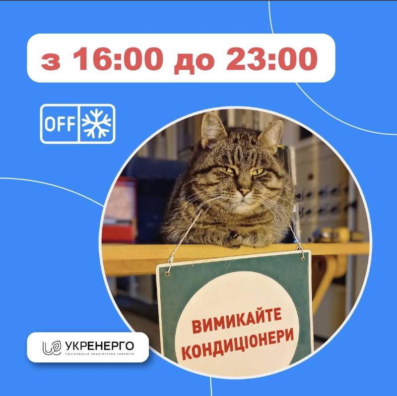 Вимкніть кондиціонер, будь ласка! Наша пухнаста колега Аза, яка вже 9 років живе на підстанції та має 3 розряд з електробезпеки, просить зменшити споживання і допомогти енергосистемі. Вона добре знає, як некомфортно у розкішній шубці в спеку. Але вивчила, що влітку багато енергооб’єктів вимикають для ремонту, тому, тим які працюють – особливо важко.