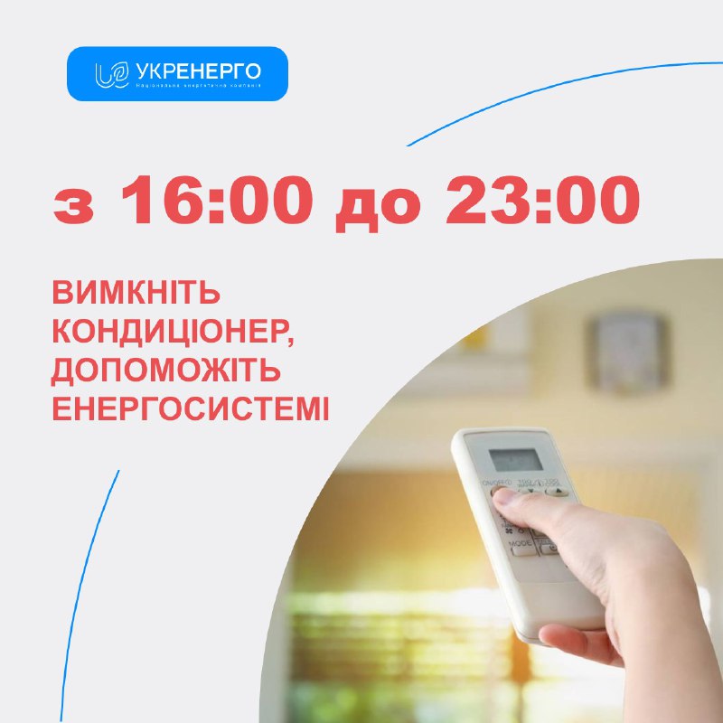 Сьогодні ще не так спекотно. Кожен з вас може допомогти енергосистемі: просимо вимкнути кондиціонери з 16:00 до 23:00 та користуватися потужними електроприладами, у цей період, по черзі. Це дозволить зменшити навантаження на енергосистему та дати їй час, щоб підготуватися до опалювального сезону.