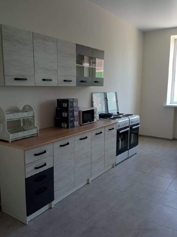 Кухня обладнана столами, стільцями, електроплитами з духовою шафою, холодильниками та посудом.
