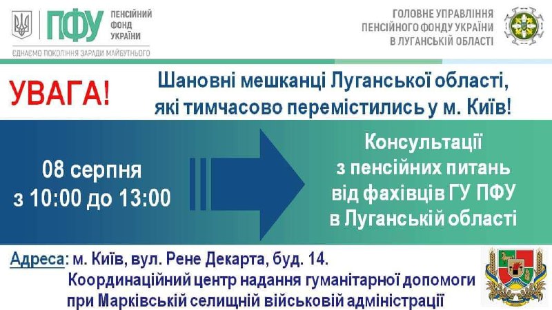 📍У вівторок, 8 серпня, внутрішньо переміщених осіб з Луганської області, які тимчасово мешкають в Києві, прийматимуть спеціалісти ГУ ПФУ в Луганській області.