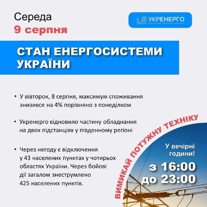 Стан енергосистеми України: 🔹у вівторок, 8 серпня, максимум споживання знизився на 4% порівняно з понеділком; 9.08.2023, Середа | 12:00 Автор допису: Голова Луганської обласної військової адміністрації Стан енергосистеми України: 🔹у вівторок, 8 серпня, максимум споживання знизився на 4% порівняно з понеділком; 🔹Укренерго відновило частину обладнання на двох підстанціях у південному регіоні; 🔹через негоду є відключення у 4-х областях, через бойові дії загалом знеструмлено 425 населених пунктів. Джерело Друк / PDF