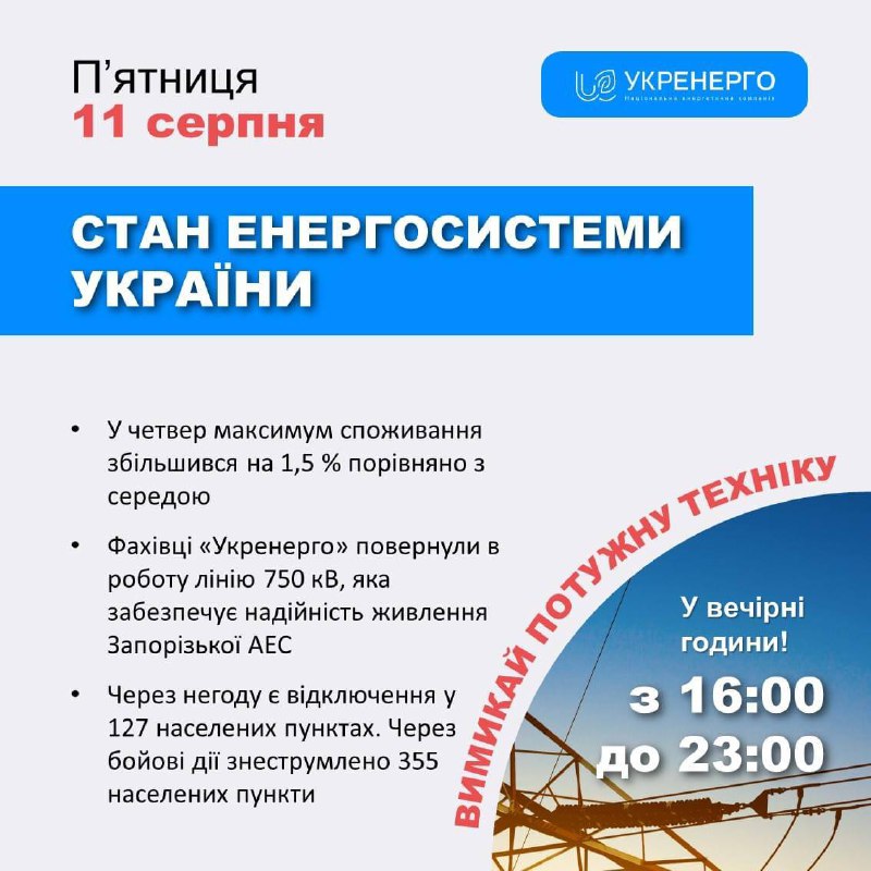 Стан енергосистеми України: 🔹у четвер, 10 серпня, максимум споживання збільшився на 1,5 % порівняно з середою;