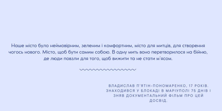 “Наше місто було неймовірним, зеленим і комфортним, місто для митців, для створення чогось нового. Місто, щоб бути самим собою. В одну мить воно перетворилося на бійню, де люди повзли для того, щоб вижити та не стати м’ясом».