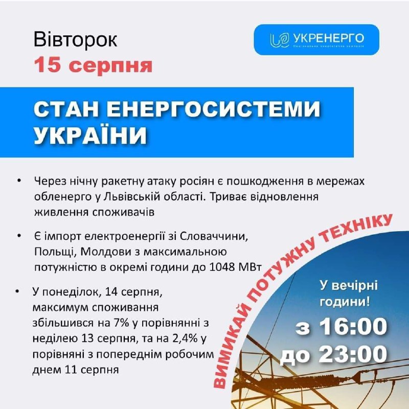 Стан енергосистеми України: 🔹Через нічну ракетну атаку росіян є пошкодження в мережах обленерго у Львівській області
