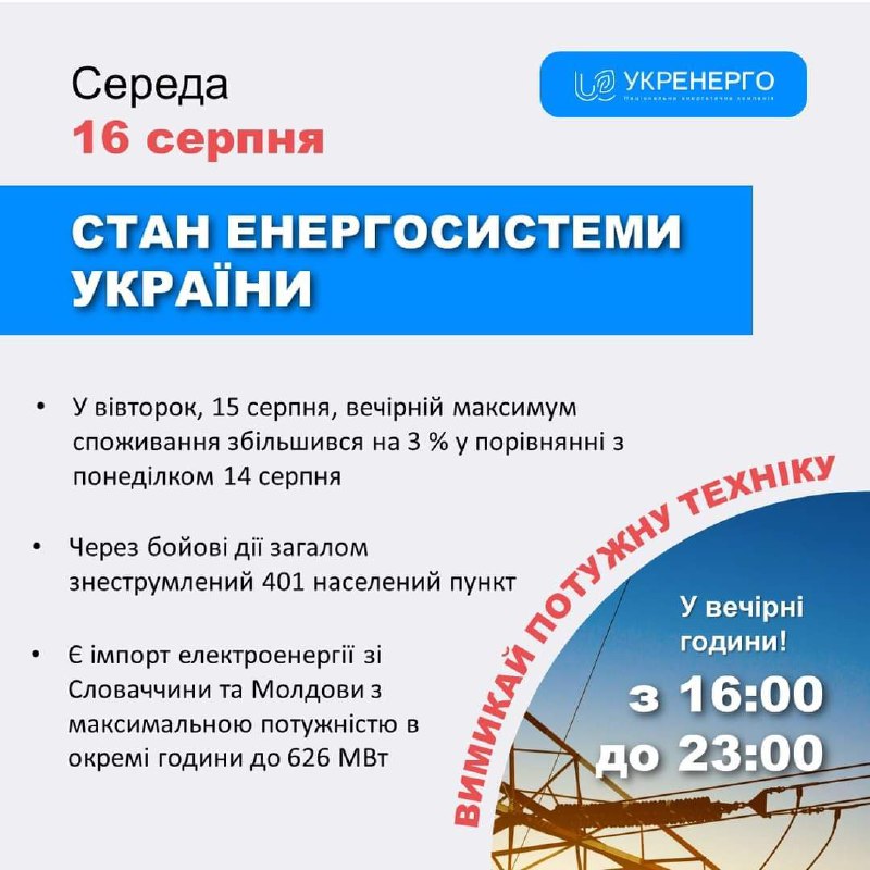 Стан енергосистеми України: 🔹у вівторок, 15 серпня, вечірній максимум споживання збільшився на 3% у порівнянні з понеділком 14 серпня; 16.08.2023, Середа | 13:34 Автор допису: Голова Луганської обласної військової адміністрації Стан енергосистеми України: 🔹у вівторок, 15 серпня, вечірній максимум споживання збільшився на 3% у порівнянні з понеділком 14 серпня; 🔹через бойові дії загалом знеструмлений 401 населений пункт; 🔹є імпорт електроенергії зі Словаччини та Молдови в ранкові та вечірні години з максимальною потужністю в окремі години до 626 МВт. Джерело Друк / PDF