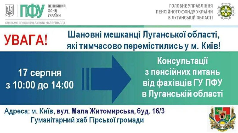17 серпня спеціалісти Головного управління Пенсійного фонду України у Луганській області прийматимуть внутрішньо переміщених осіб регіону, які тимчасово мешкають в Києві.