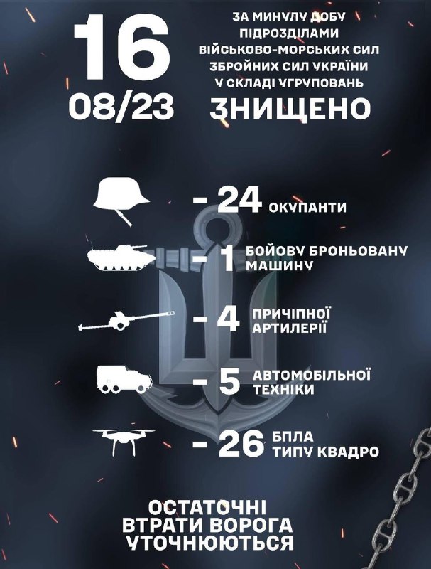 Минулої доби, підрозділами ВМС ЗС України знищено 24 окупанти, 1 бойову броньовану машину, 4 одиниці причіпної артилерії, 5 одиниць автомобільної техніки та 26 квадрокоптерів.