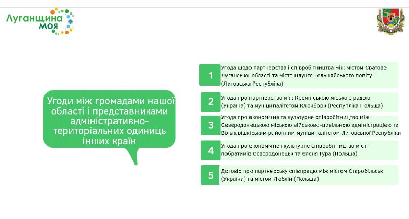 Наразі Луганська облдержадміністрація уклала 7 міжрегіональних угод про співробітництво: з Польщею, Болгарією, Францією, Австрієюта іншими країнами світу. В процесі підготовки до співпраці з Албанією.