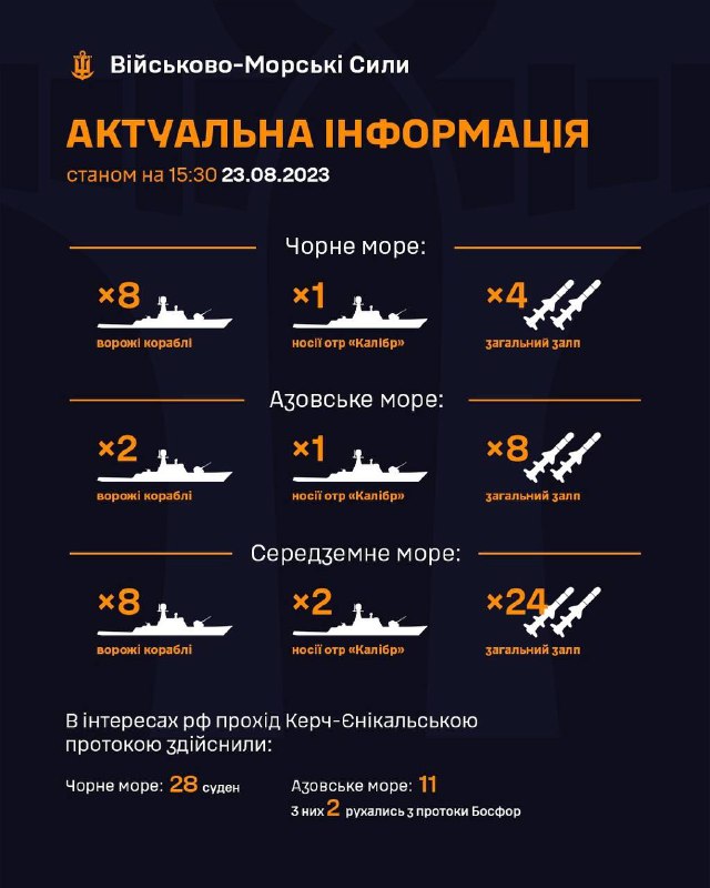 Станом на 15:30 23.08.2023: в Чорному морі на бойовому чергуванні знаходиться 8 ворожих кораблів