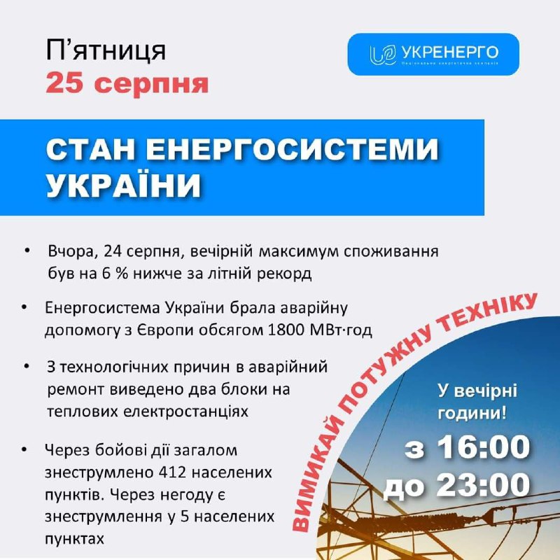 🔹вчора, 24 серпня, вечірній максимум споживання був на 6 % нижче за літній рекорд;