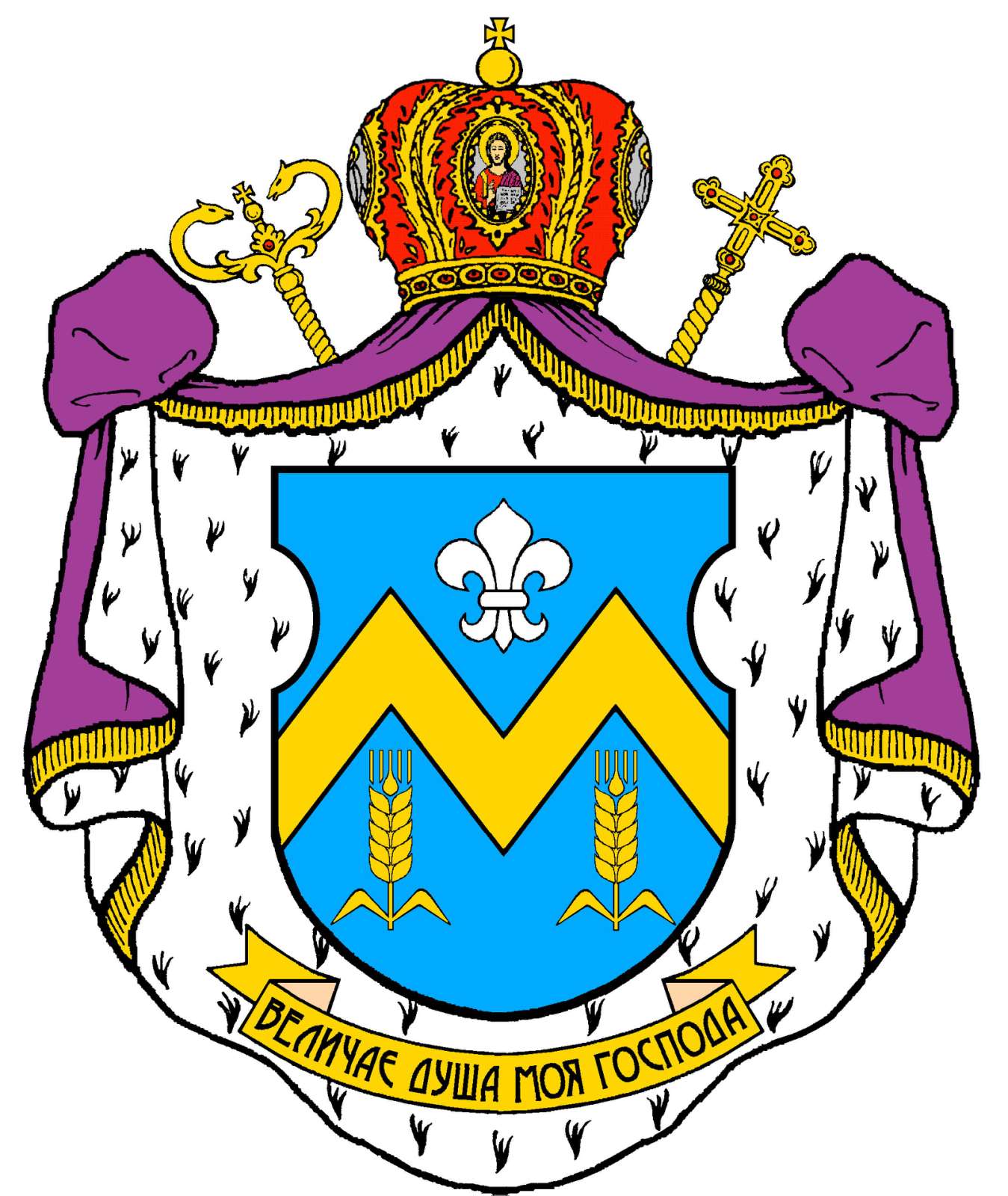 Щит вписано у декоративний картуш на пурпуровій мантії, підбитій горностаєм, увінчаній золотою єпископською митрою з червоним підкладом. Обабіч виходять золоті єпископський жезл (праворуч) і процесійний хрест (ліворуч). Під щитом на золотій стрічці девіз: «ВЕЛИЧАЄ ДУША МОЯ ГОСПОДА» (Лк 1, 46).