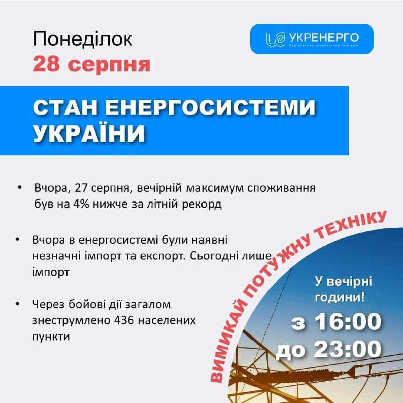 Стан енергосистеми України: 🔹вчора, 27 серпня, вечірній максимум споживання був на 4 % нижче за літній рекорд; 28.08.2023, Понеділок | 15:14 Автор допису: Голова Луганської обласної військової адміністрації Стан енергосистеми України: 🔹вчора, 27 серпня, вечірній максимум споживання був на 4 % нижче за літній рекорд; 🔹вчора в енергосистемі були наявні у незначних обсягах експорт та імпорт. Сьогодні, 28 серпня – тільки імпорт; 🔹через бойові дії залишаються знеструмленими 436 населених пункти. Джерело Друк / PDF