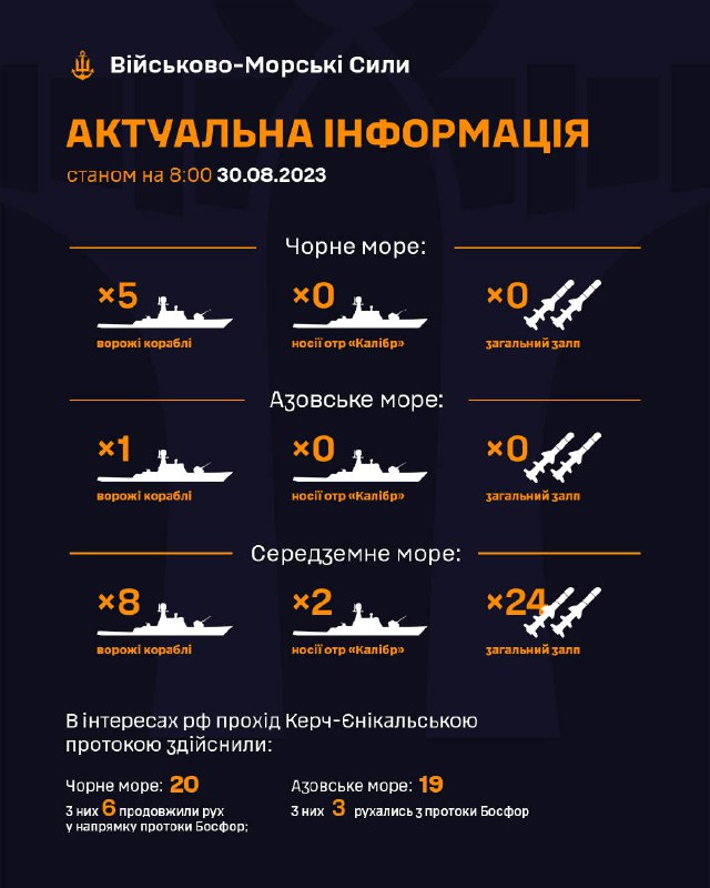 Станом на 8:00 30.08.2023: в Чорному морі на бойовому чергуванні знаходиться 5 ворожих кораблів; в Азовському морі
