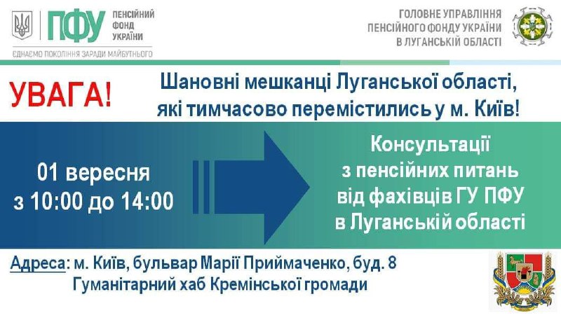 У Києві 1 вересня наших ВПО консультуватимуть з пенсійних питань 1 вересня співробітники ГУ ПФУ в Луганській… 30.08.2023, Середа | 10:49 Автор допису: Голова Луганської обласної військової адміністрації У Києві 1 вересня наших ВПО консультуватимуть з пенсійних питань 1 вересня співробітники ГУ ПФУ в Луганській області прийматимуть внутрішньо переміщених осіб з нашого регіону, які тимчасово мешкають у Києві. Звернутися за вирішенням пенсійних питань можна з 10:00 до 14:00 до хабу Кремінської громади. 📍Адреса: м. Київ, вул. М. Приймаченко, 8 (ст. метро «Звірінецька»). Джерело Друк / PDF