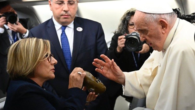 Коли Папа особисто вітався з представниками засобів комунікації, йому показали флягу, яку до одного з львівських храмів приніс військовий, який врятувався після вибуху. Згодом її отримала журналістка Ева Фернандес із Radio Cope, яка й представила предмет Святішому Отцеві, розповівши його історію. Після того, як Папа її поблагословив, фляга зі слідами війни буле повернене назад до цього храму.