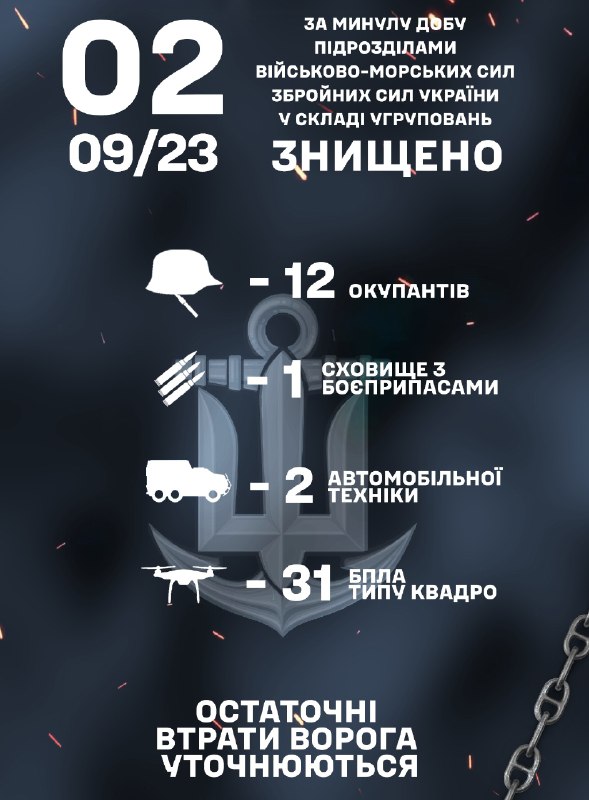Минулої доби, підрозділами ВМС ЗС України знищено 12 окупантів, 1 сховище з боєприпасами, 2 одиниці автомобільної техніки та 31 квадрокоптер.