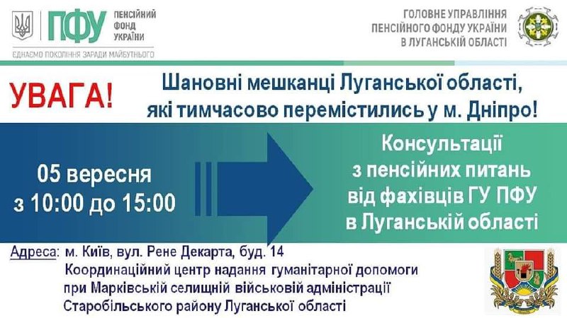 У вівторок в Києві наші переселенці зможуть звернутися з питаннями пенсійного забезпечення 3.09.2023, Неділя | 12:19 Автор допису: Голова Луганської обласної військової адміністрації У вівторок в Києві наші переселенці зможуть звернутися з питаннями пенсійного забезпечення 5 вересня спеціалісти ГУ ПФУ в Луганській області прийматимуть внутрішньо переміщених осіб з нашого регіону, які тимчасово мешкають у Києві. Звернутися за вирішенням пенсійних питань можна з 10:00 до 15:00 до хабу Марківської селищної військової адміністрації. 📍Адреса: м. Київ, вул. Рене Декарта, буд. 14. Джерело Друк / PDF
