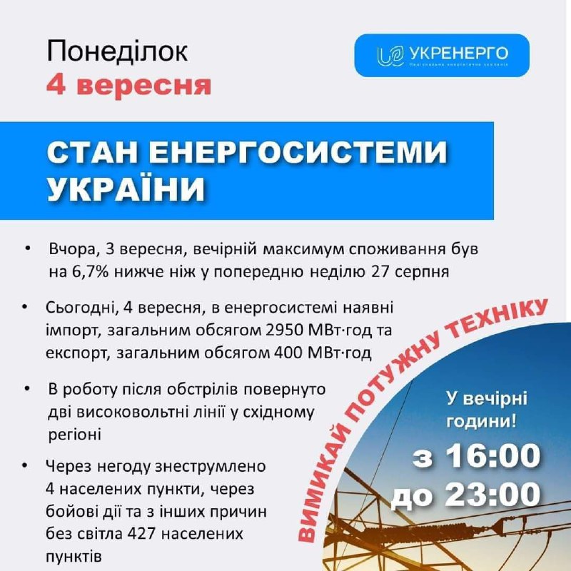 🔹сьогодні, 4 вересня, в енергосистемі наявні імпорт, загальним обсягом 2950 МВт·год та експорт, загальним обсягом 400 МВт·год;