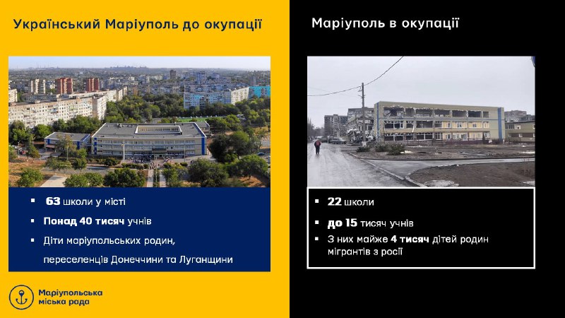«В українському Маріуполі отримували освіту понад 40 тисяч дітей. Зараз менше 15 тисяч дітей, з них – 3 600 учні родин мігрантів із росії. У місті якось працює 22 школи, з яких дві у дистанційному форматі, деякі у напіввідремонтованому стані. Але 60% меблювання залишилося від Нової Української Школи, а в деяких закладах – воно повністю українське. Українську мову офіційно не забороняють, а неофіційно є наказ зробити все, щоб вона не лунала в школах. Школи в окупації – це машини російської пропаганди, де викорінюється все українське, примусово нав’язується любов до країни-терориста росії», – мер Маріуполя Вадим Бойченко.