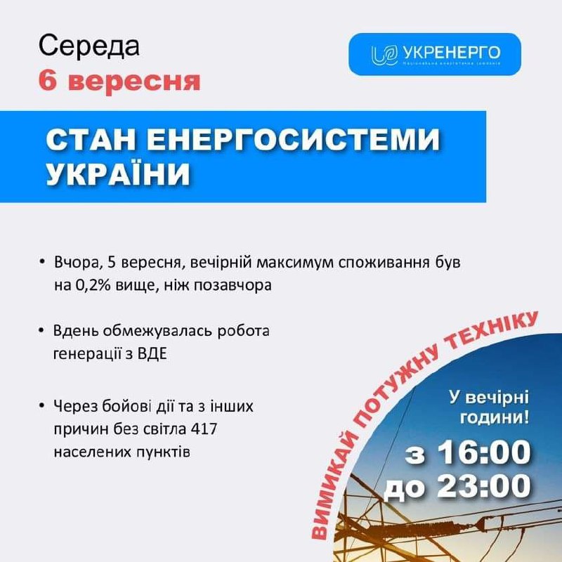 Стан енергосистеми України: 🔹вчора, 5 вересня, вечірній максимум споживання був на 0,2% вище, ніж позавчора