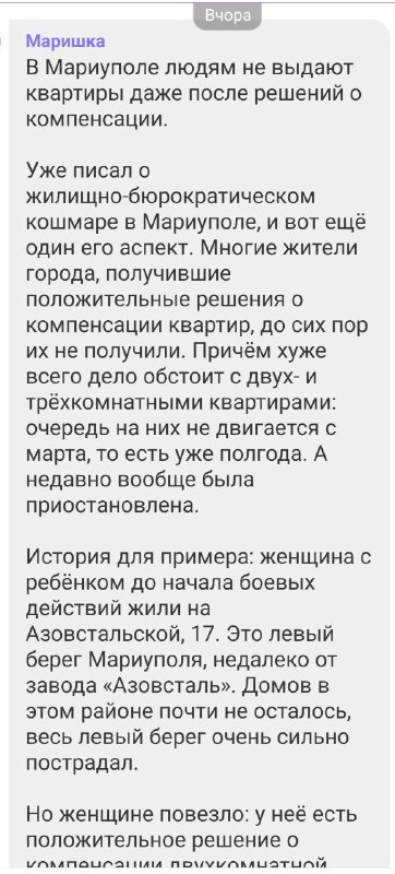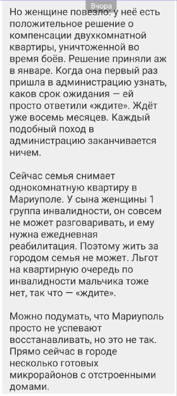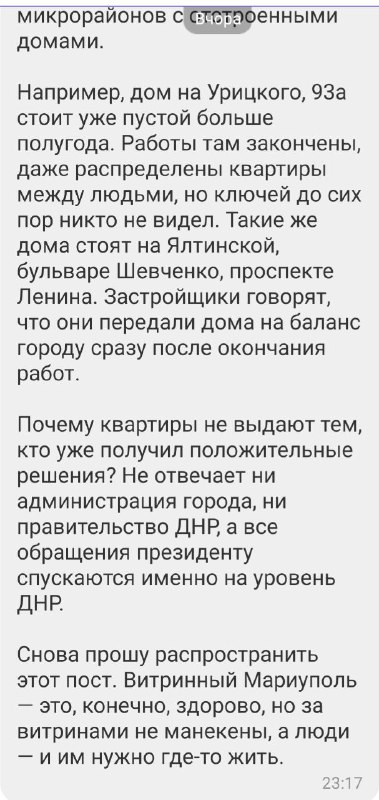 Проблема з розміщенням маріупольців у т.о. Маріуполі набуває просто колосальним розмірів. Проте, за нашими даними, розселення маріупольців не відбувається через неякісні матеріали та відхилення від норм будівництва росіянами. Тож ці будівлі просто не можуть стояти на балансі міста.