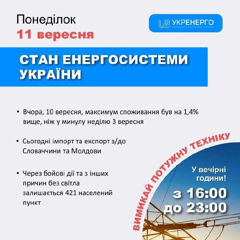 Стан енергосистеми України: 🔹Вчора, 10 вересня, максимум споживання був на 1,4% вище, ніж у минулу неділю 3 вересня 11.09.2023, Понеділок | 12:40 Автор допису: Голова Луганської обласної військової адміністрації Стан енергосистеми України: 🔹Вчора, 10 вересня, максимум споживання був на 1,4% вище, ніж у минулу неділю 3 вересня; 🔹Сьогодні імпорт та експорт з/до Словаччини та Молдови; 🔹Через бойові дії та з інших причин без світла залишається 421 населений пункт. Джерело Друк / PDF