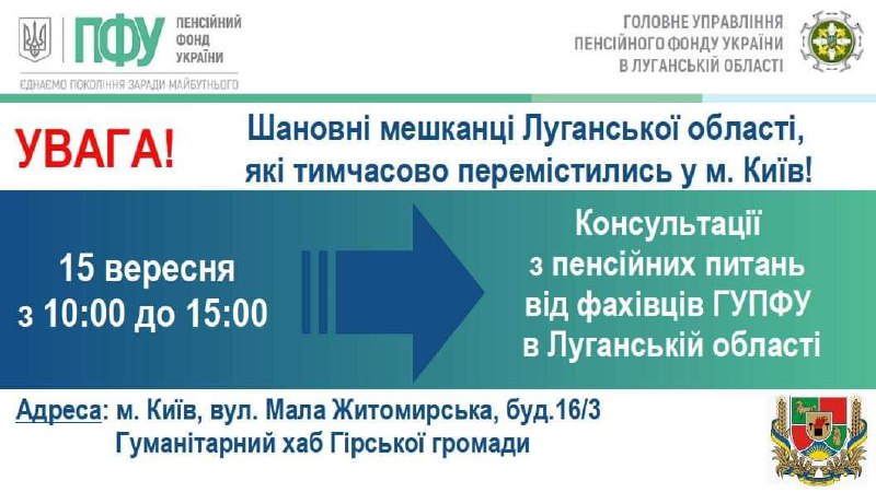 📍Звернутися за вирішенням пенсійних питань можна з 10:00 до 15:00 до хабу Гірської громади за адресою: м. Київ, вул. Мала Житомирська, буд. 16/3.