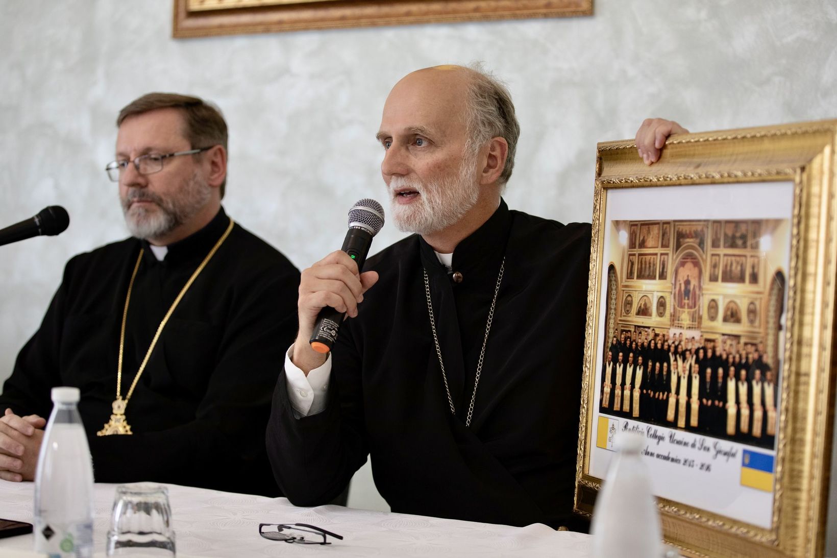 Архиєпископ Борис Ґудзяк показав журналістам фотографію студентів Папської колегії 2015–2016 років, серед яких Олег Цуньовський, що був на фронті і внаслідок поранення втратив руку та ногу. «Такі хлопці і дівчата платять сьогодні високу ціну за те, що ми називаємо європейськими цінностями», — наголосив митрополит Борис. Він вказав і на той факт, що майже 30 років тому Україна відмовилася від ядерної зброї, «здійснивши не лише політичний, а й євангельський жест». «Після розпаду Радянського Союзу наша держава мала третій за розміром ядерний потенціал. Україна ніколи не готувалася до війни і через добровільну втрату ядерного статусу продемонструвала всьому світові свої наміри побудови миру у відносинах міжнародного співіснування», — наголосив владика Борис та закликав світову спільноту пам’ятати про цей факт, коли йдеться про гарантії безпеки для України.