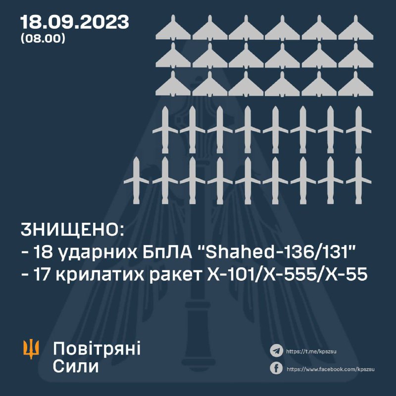 Сили ППО в небі над Україною знищили 18 шахедів та 17 крилатих ракет. На Кіровоградщині – без надзвичайних ситуацій.