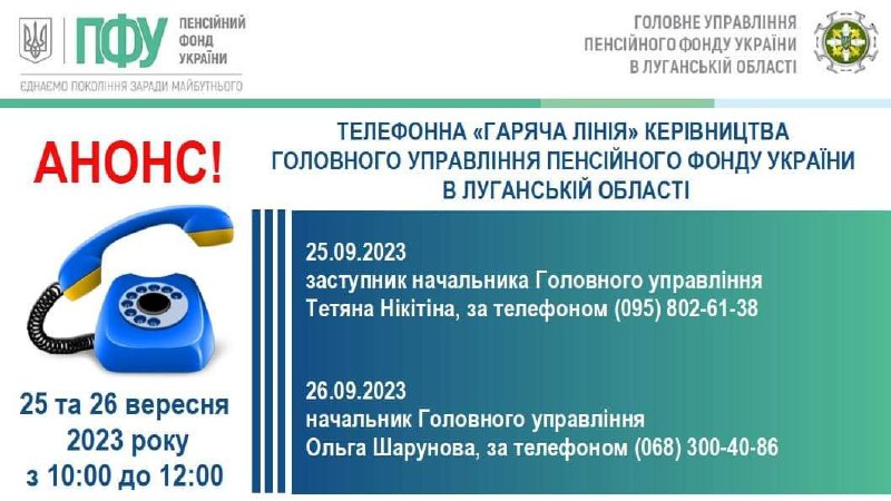 У вівторок, 26 вересня, із 10:00 до 12:00 на дзвінки відповідатиме начальник Головного управління Пенсійного фонду України у Луганській області Ольга Шарунова. Телефон: (068) 300-40-86.