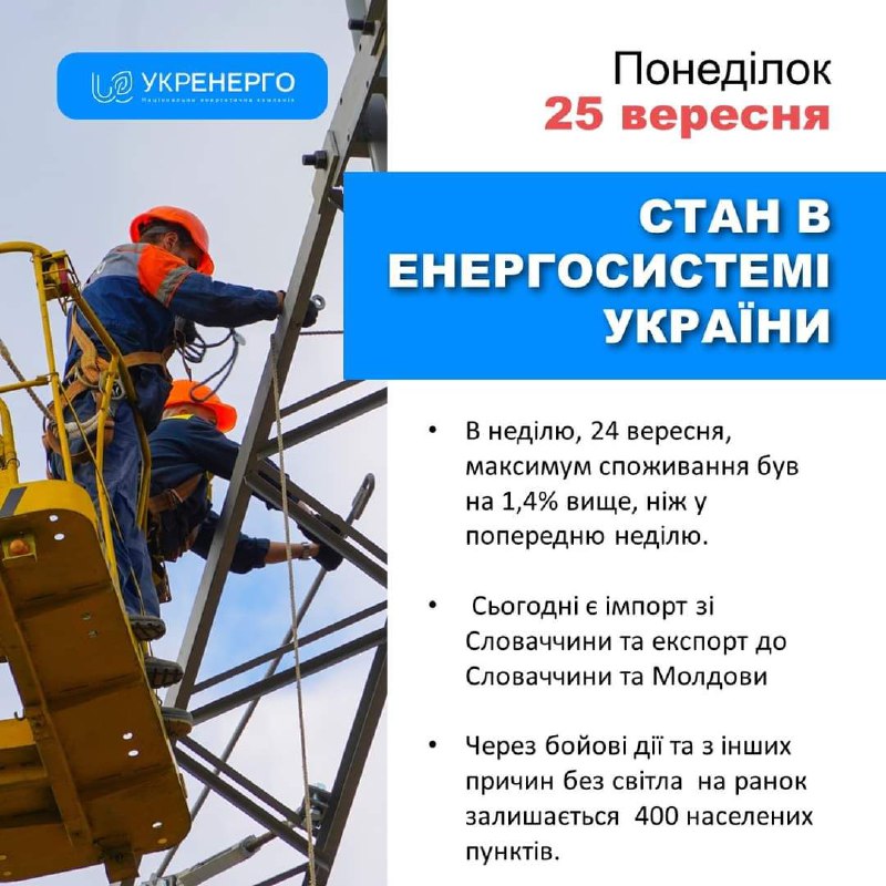 🔹Через бойові дії та з інших причин без світла на ранок залишається 400 населених пунктів.