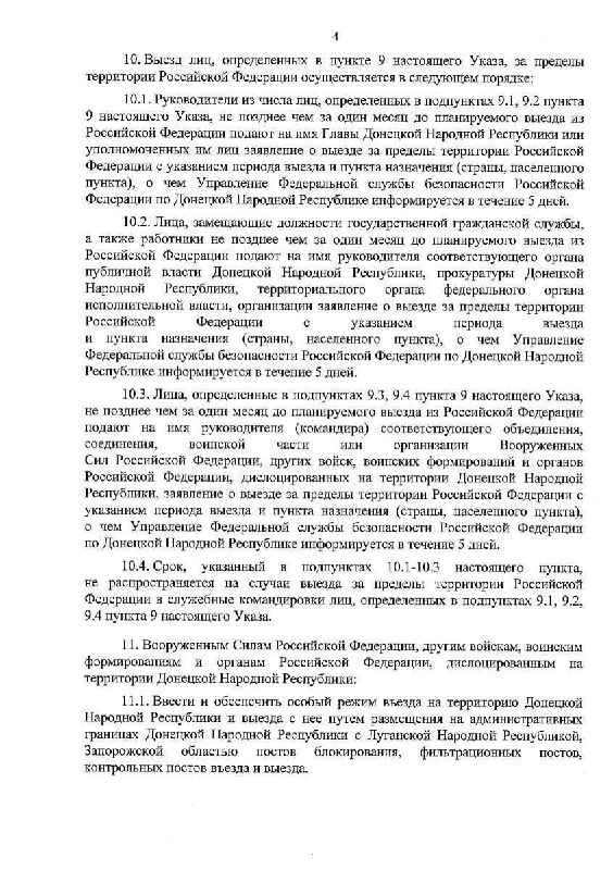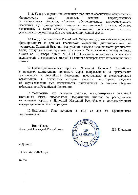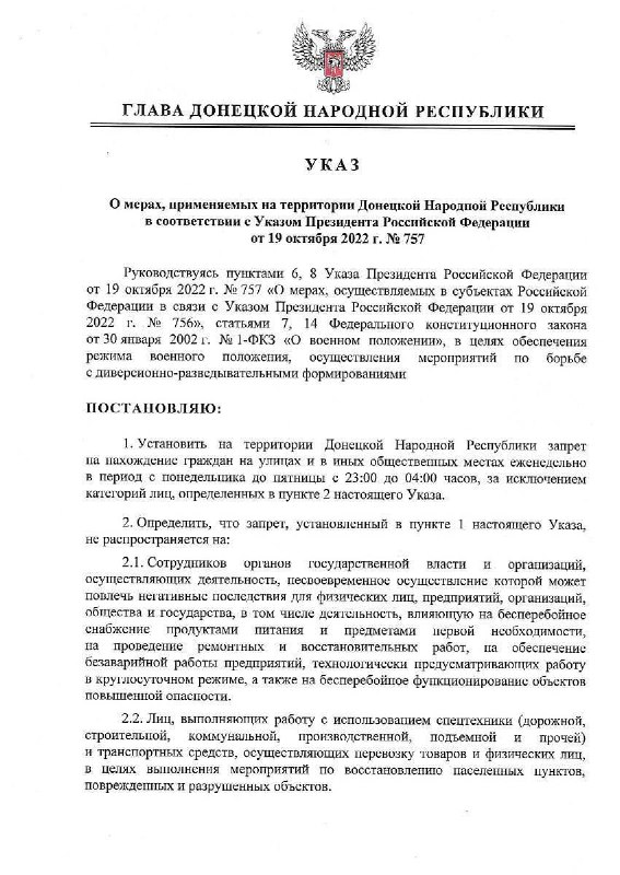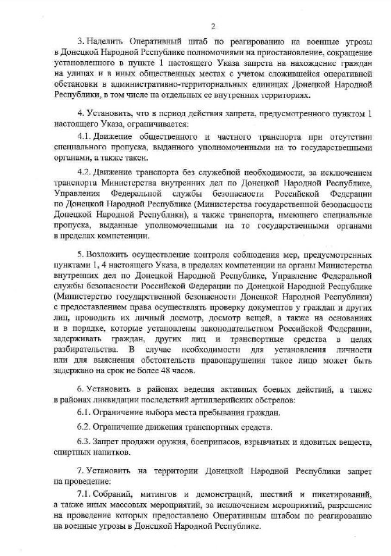 Згідно з документом, населенню Донетчини забороняється влаштовувати мітинги та страйки, обмежують вибір місць перебування громадян, дозволяється репресивним органам вести прослуховування телефонів, читати листи та інтернет-листування. Забороняється виїзд чиновників, бюджетників та колишніх військовослужбовців (дозвіл потрібно отримувати за місяць), а також заборона на діяльність іноземних та міжнародних організацій, дії яких, на думку мвд днр, спрямовані на «підрив оборони та безпеки РФ». Триває фільтрація на кордонах та діє комендантська година.