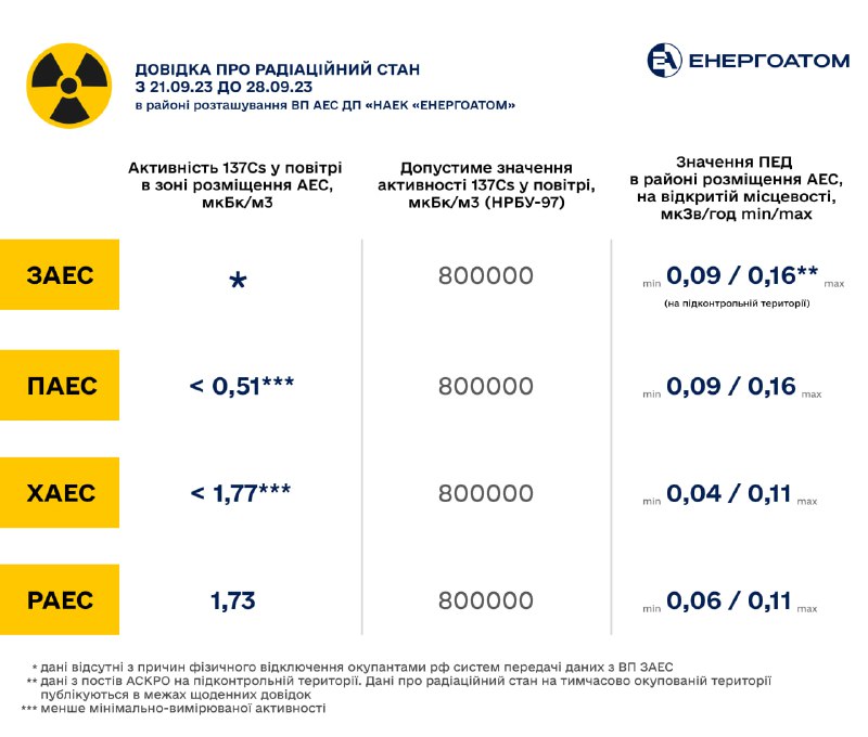 ☢️ Довідка про радіаційний стан у період з 21 по 28 вересня 2023 року в районі розташування ВП АЕС ДП «НАЕК «Енергоатом» 29.09.2023, П’ятниця | 17:24 Автор допису: Енергоатом ☢️ Довідка про радіаційний стан у період з 21 по 28 вересня 2023 року в районі розташування ВП АЕС ДП «НАЕК «Енергоатом» THEA Джерело Друк / PDF
