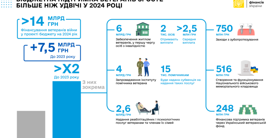 У проекті держбюджету на 2024 рік Уряд передбачив істотне переосмислення підходів до ветеранської політики та збільшив фінансування цього напряму на 7,5 млрд грн (що удвічі більше ніж у 2023 році) – до понад 14 млрд гривень.