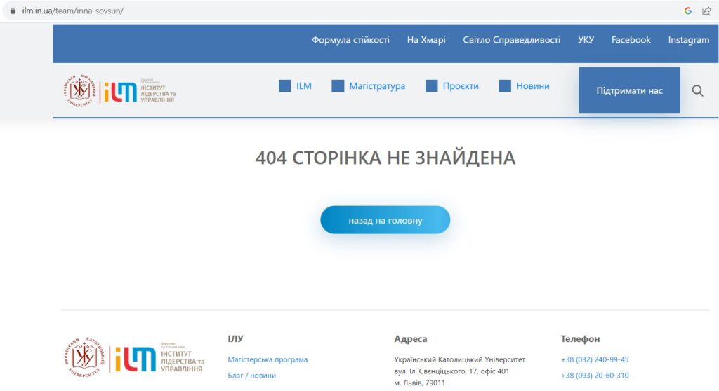 Сайт Інституту лідерства та управління УКУ видалив інформацію про те, що до числа його викладачів належить топ-лобістка ЛГБТ-ідеології Інна Совсун.