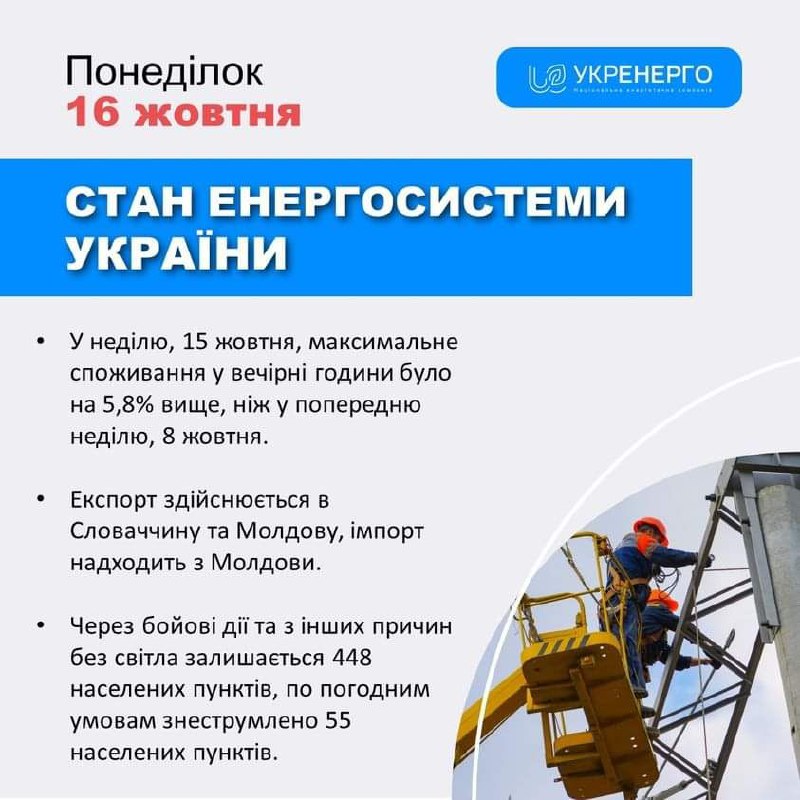 🔹Через бойові дії та з інших причин без світла залишається 448 населених пунктів, по погодним умовам 55 населених пунктів.