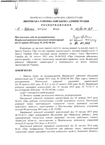 Розпорядження Яворівської районної військової адміністрації “Про внесення змін до розпорядження Яворівської районної військової адміністрації від 22 червня 2023 року №24/02-06 ВА ” №44/02-06 від 15 вересня 2023 року