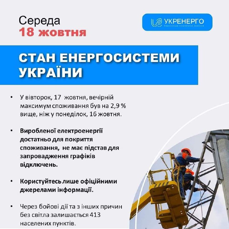 СТАН ЕНЕРГОСИСТЕМИ УКРАЇНИ: 🔹У вівторок, 17 жовтня, вечірній максимум споживання був на 2,9 % вище, ніж у понеділок, 16 жовтня;