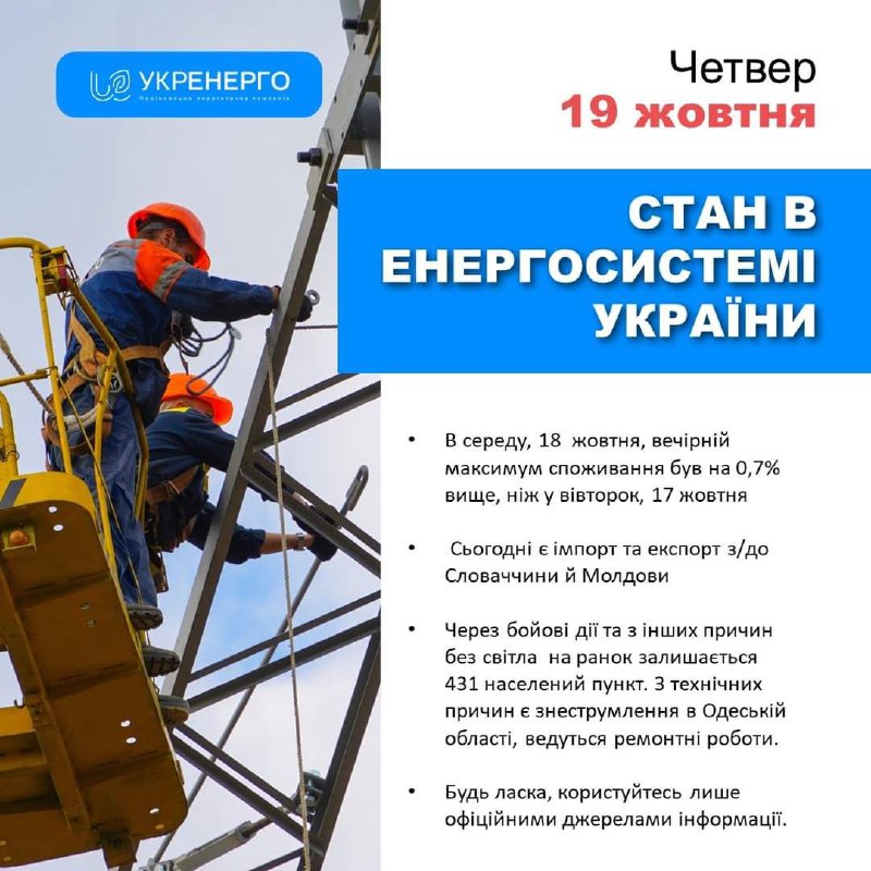 🔹Через бойові дії та з інших причин без світла залишається 431 населений пункт;