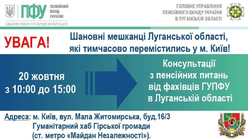 20 жовтня спеціалісти ГУ ПФУ в Луганській області прийматимуть внутрішньо переміщених осіб з нашого регіону, які тимчасово мешкають в Києві.