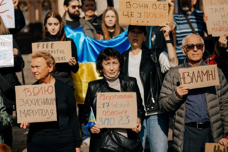 ☝️З такими написами на плакатах вийшли маріупольці, близькі та родини полонених оборонців Маріуполя у Тернополі. Своєю акцією учасники хотіли привернути увагу суспільства, міжнародних організацій до важливості боротьби за визволення захисників та захисниць, які досі перебувають у російському полоні.