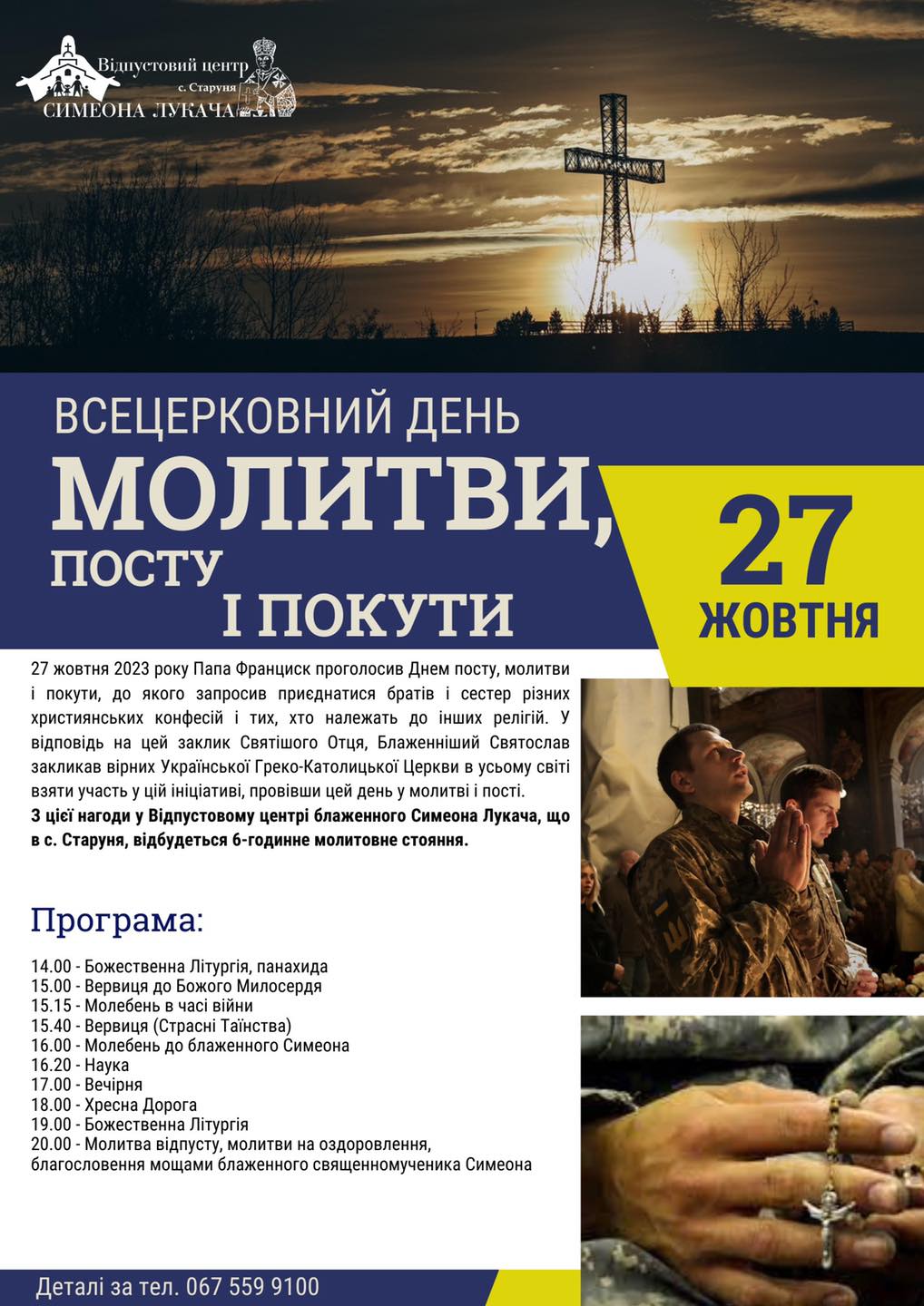 Нещодавно Папа Франциск проголосив 27 жовтня 2023 року Днем посту, молитви і покути, до якого запросив приєднатися братів і сестер різних християнських конфесій і тих, хто належить до інших релігій. З цієї нагоди у Відпустовому центрі блаженного Симеона Лукача, що в с. Старуня, відбудеться 6-годинне молитовне стояння.