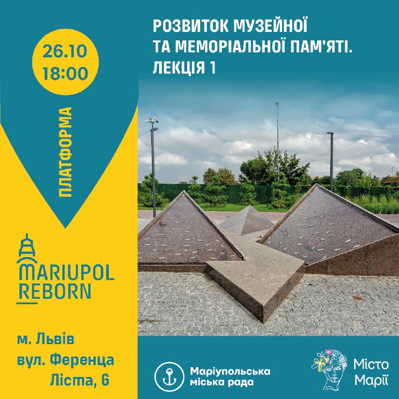 ✅Завтра, 26 жовтня, на платформі «Mariupol Reborn» у Львові відбудеться лекція експертів з теми: «Розвиток музейної та меморіальної пам’яті». Це погляд на події російсько-української війни очима фахівців і фахівчинь, які працюють з темами пам’яті, меморіалізації, відображення трагічної історії в музейному та міському просторах.